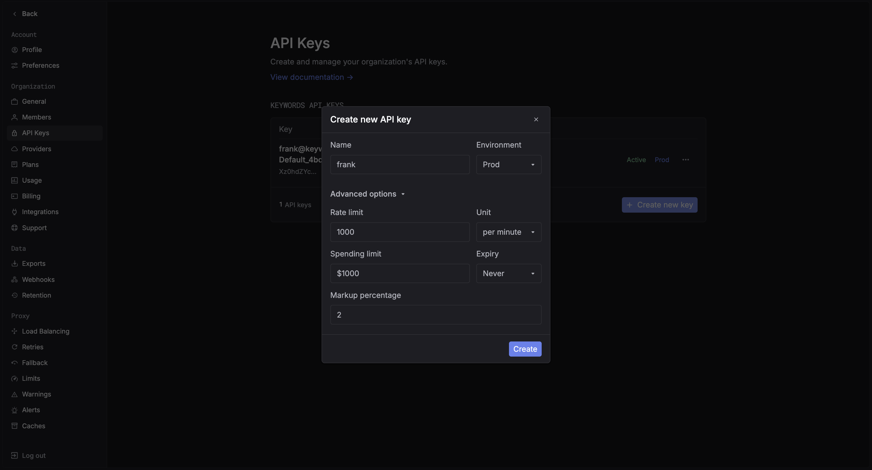 Markup percentage is the percentage of the usage that you want to add to the usage of the API key. This is used to give you a better flexibility in your usage.