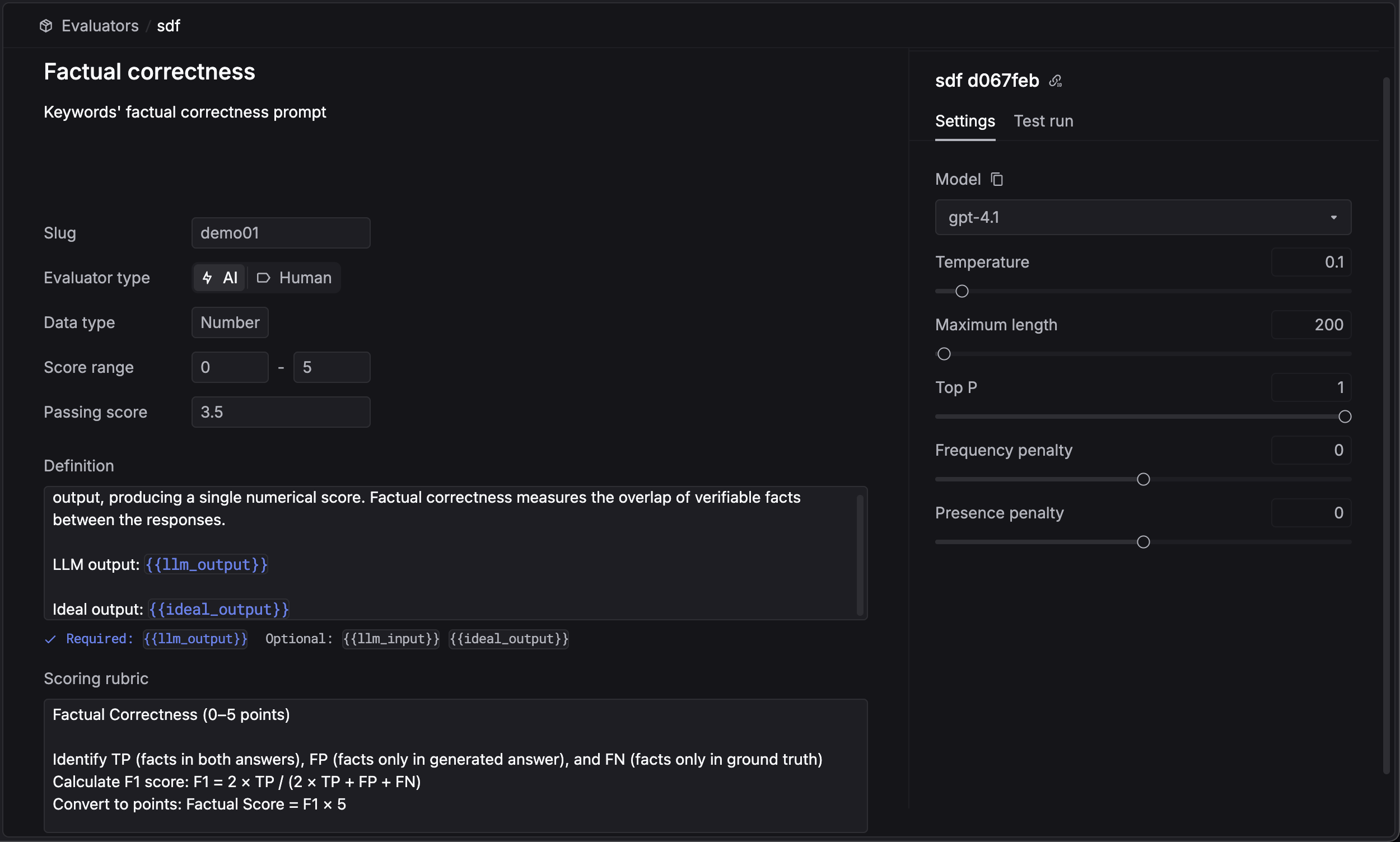 Here’s a sample evaluator configuration. We’ll describe each section in detail below.