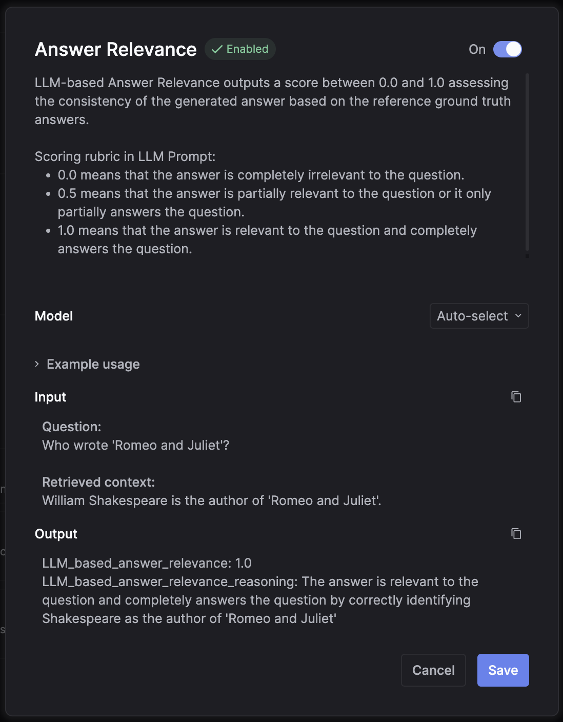 - 1.0 means that the answer is relevant to the question and completely answers the question.