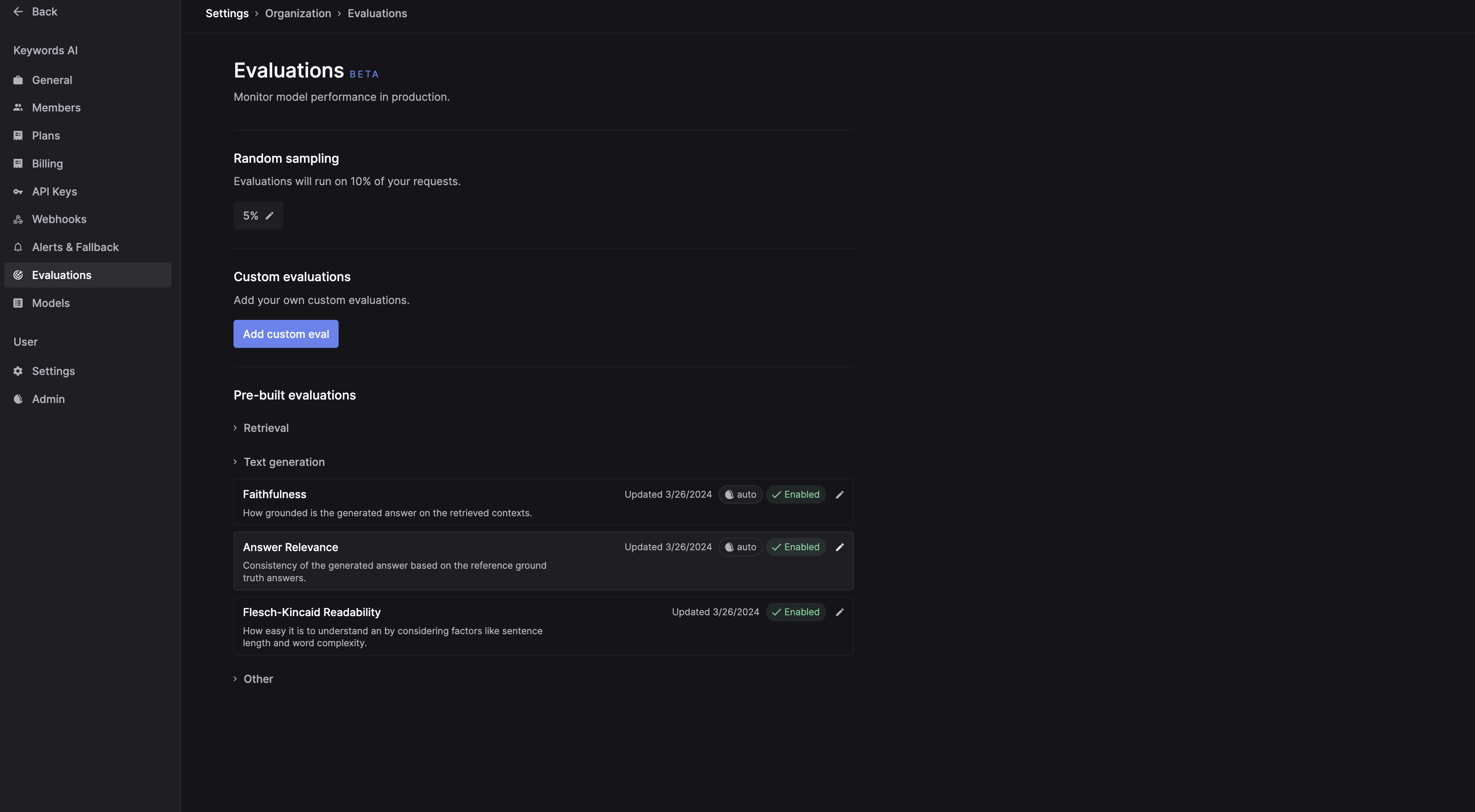 - Go to Keywords AI (on top of the left nav bar) > Evaluation > Text generation > Answer Relevance