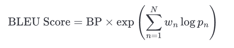p_nis the n-gram precision,w_nis the weight for each n-gram, and BP is the brevity penalty to penalize short answers)