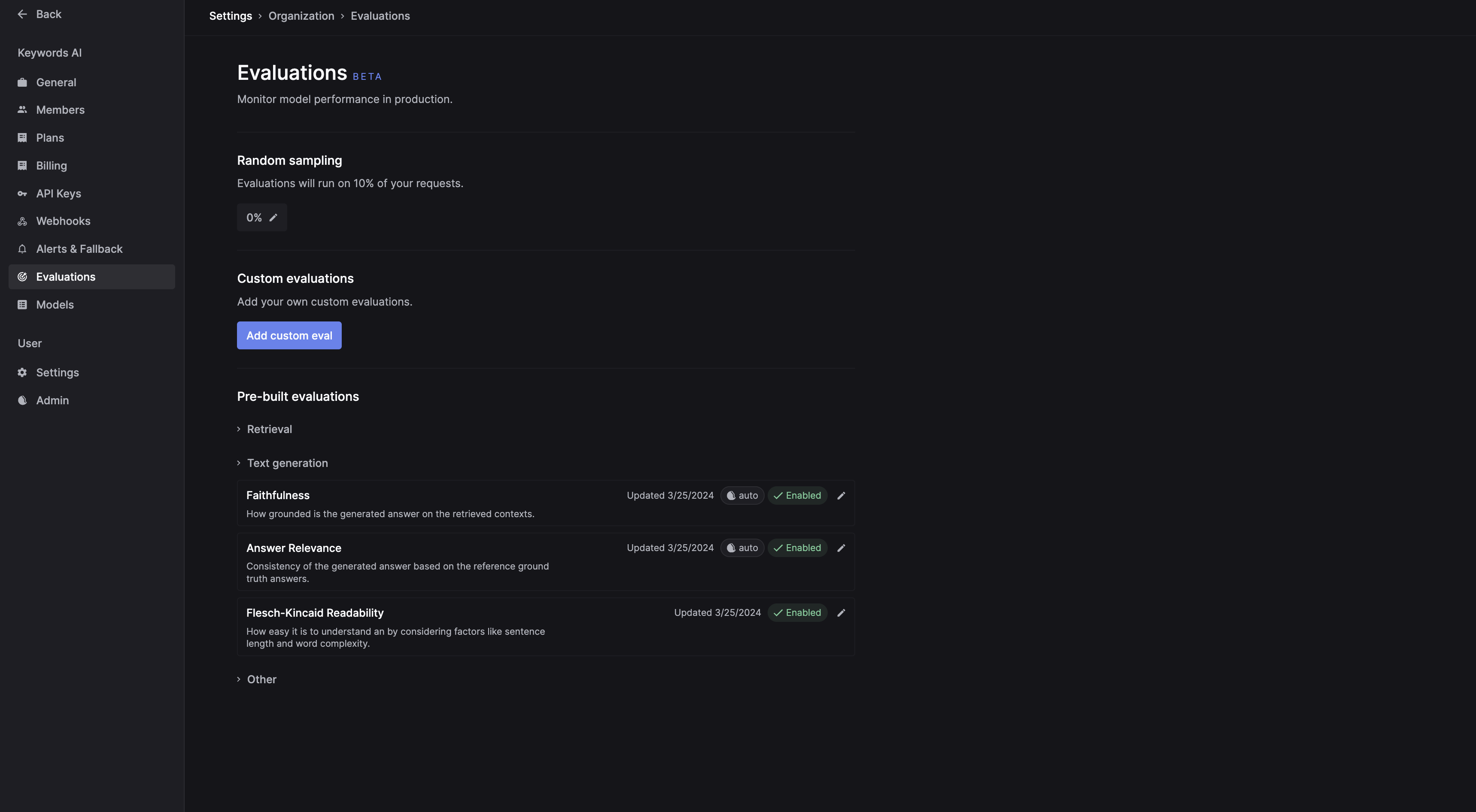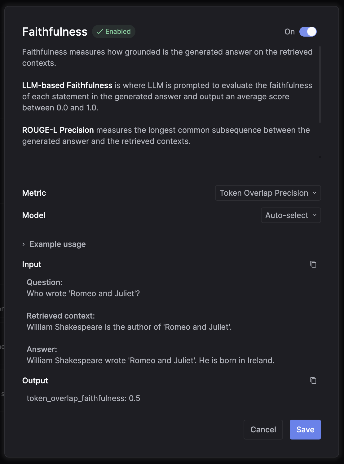 - Go to Keywords AI (on top of the left nav bar) > Evaluation > Text generation > Faithfulness
