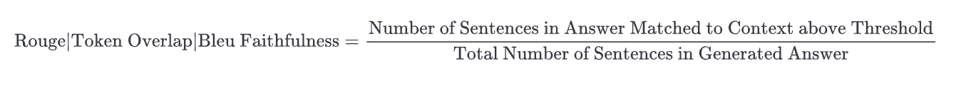 - Rouge|Token Overlap|Bleu Faithfulness is defined as the proportion of the sentences in the generated answer that can matched to the retrieved context above a