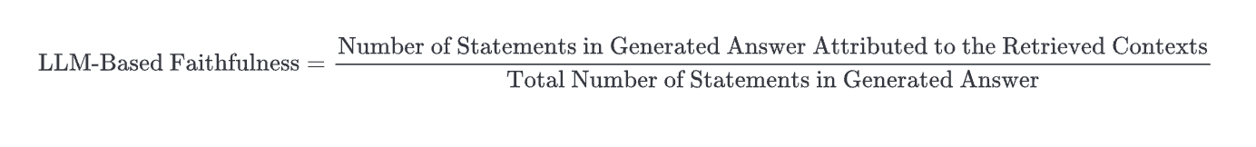 Keywords AI prompts the LLM to calculate faithfulness based on classifying faithfulness by statement:classify_by_statement = TRUE where LLM is prompted to evaluate the faithfulness of each statement in the Generated Answer and outputs a float score: