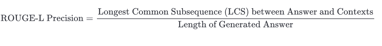 Below is the list of deterministic metrics that measure the relationship between the generated answer and the retrieved contexts.- ROUGE-L precision measures the longest common subsequence between the generated answer and the retrieved contexts.