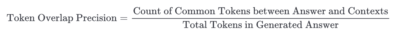 - Token overlap precision calculates the precision of token overlap between the generated answer and the retrieved contexts.