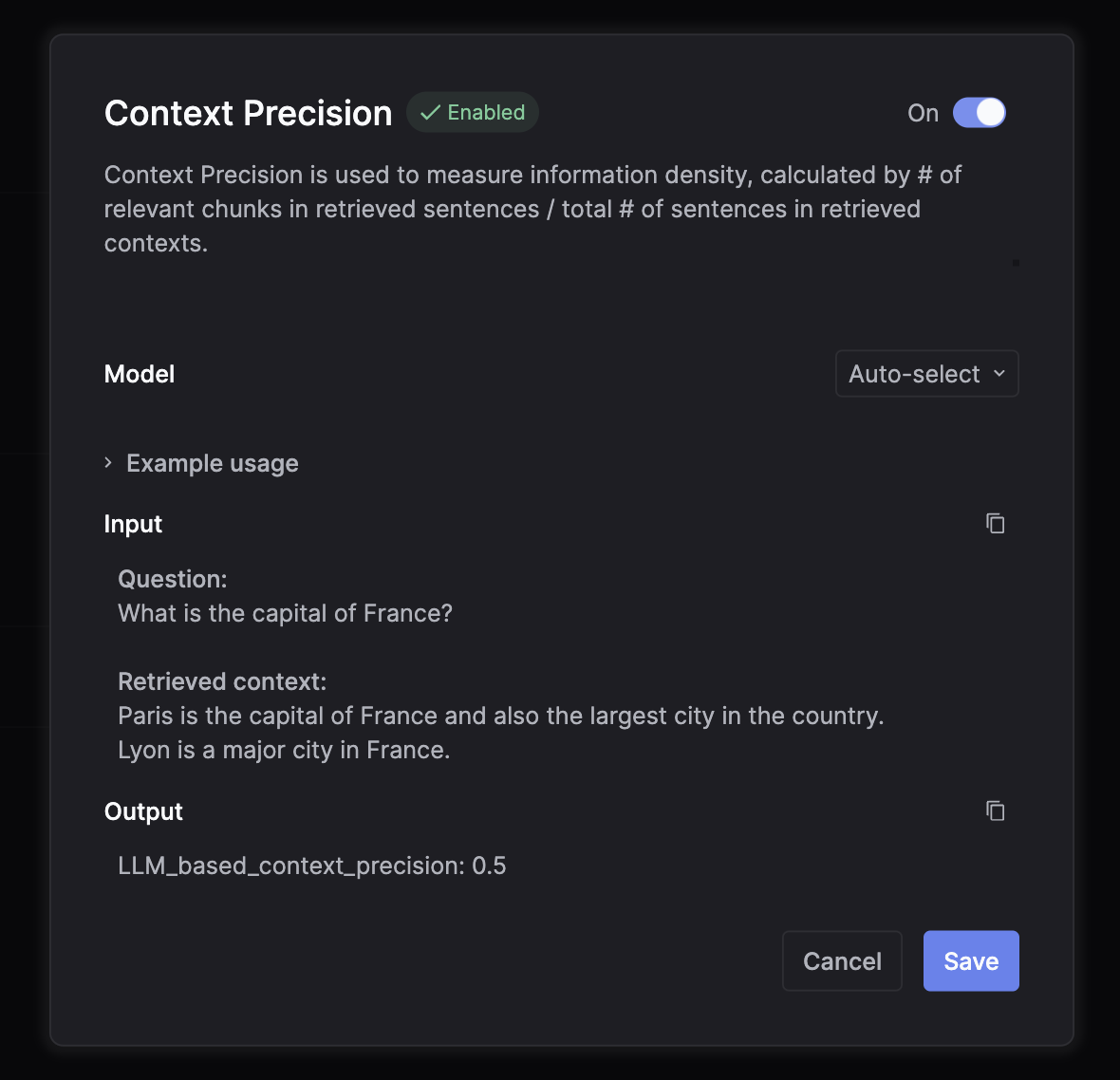 - Go to Keywords AI (on top of the left nav bar) > Evaluation > Retrieval > Context Precision
