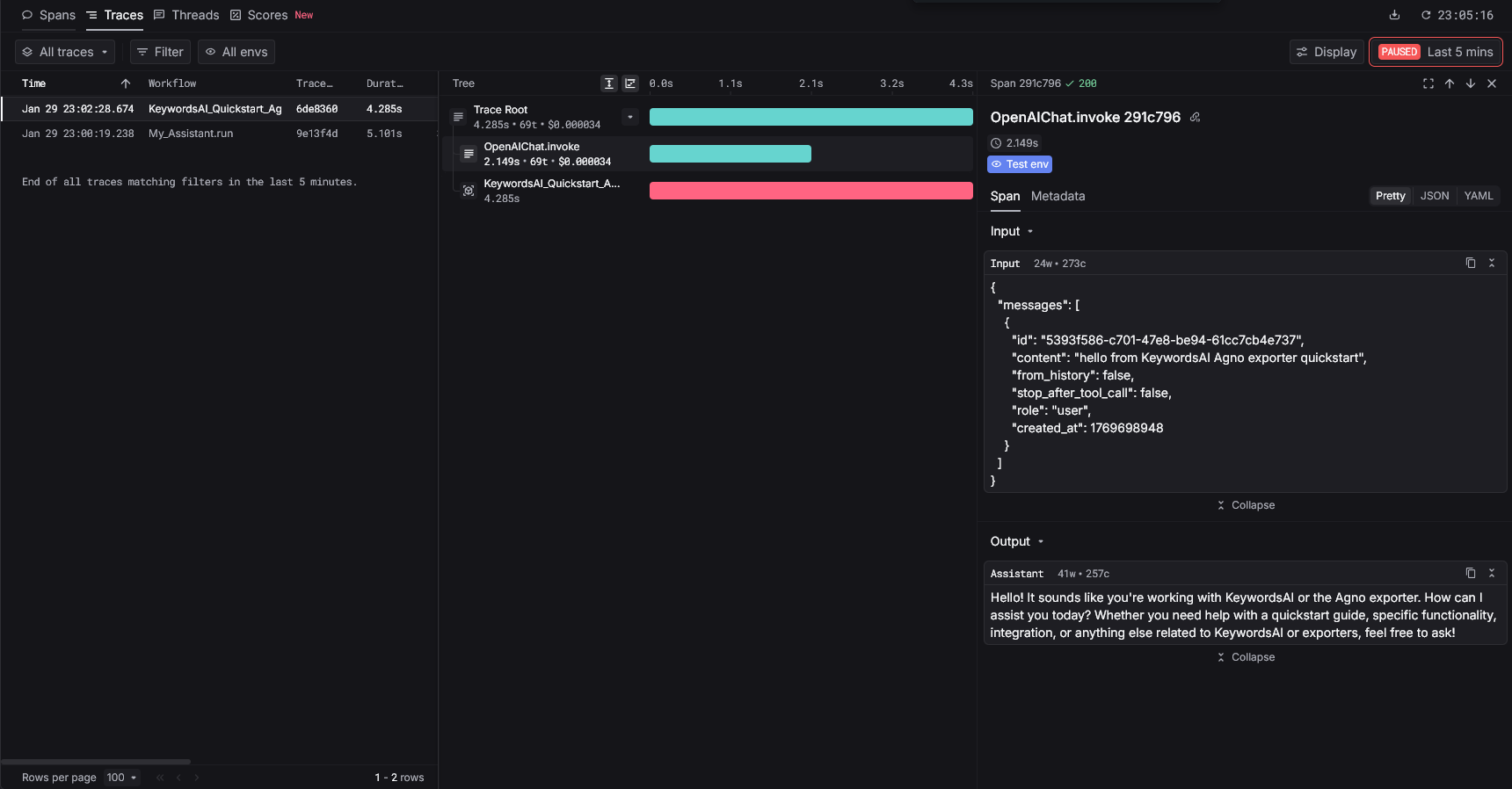 agent.run("hello from KeywordsAI Agno exporter quickstart")